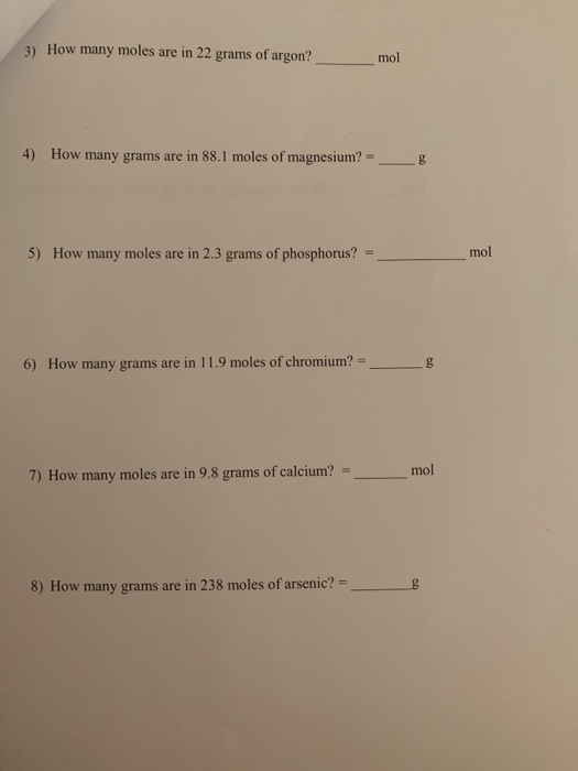 1 mole is equal to 1 moles In or 114818 grams. The number of moles of Ar is 055 moles. 9 How many moles are in 607 grams of argon.